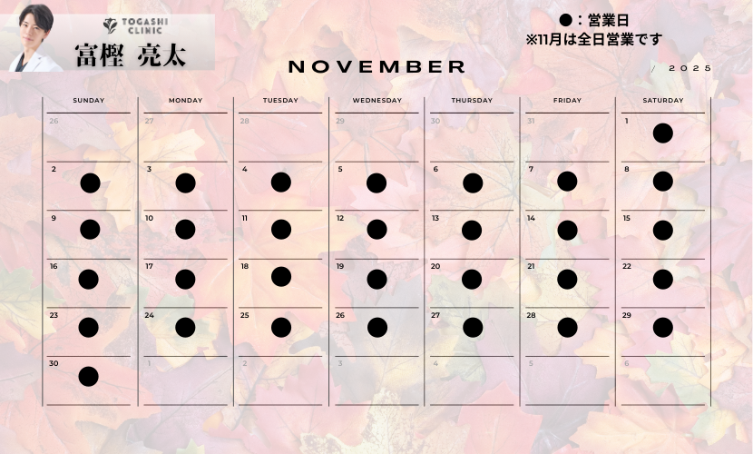 TOGASHI CLINIC開業を記念して、 11/1~11/31までの間は全日営業をしております。